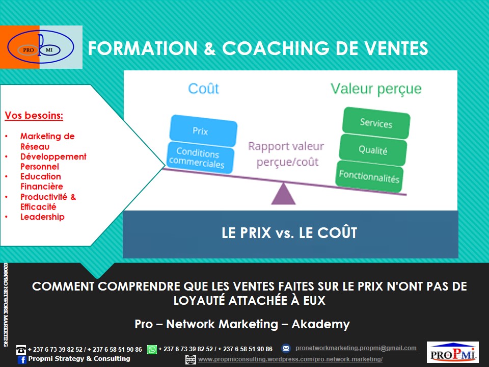 PROFITEZ DE NOTRE EXPERTISE & EXPERIENCE EN FORMATION & COACHING DE VENTES Êtes-vous PRÊT pour devenir un meilleur vendeur / une meilleure vendeuse? FORMATION: LE PRIX VS. LE COÛT Introduction: Si le client achète un prix, c’est parce qu’il ne perçoit aucune valeur supplémentaire (Valeur perçue). Mais si votre présentation de vente se concentre sur…