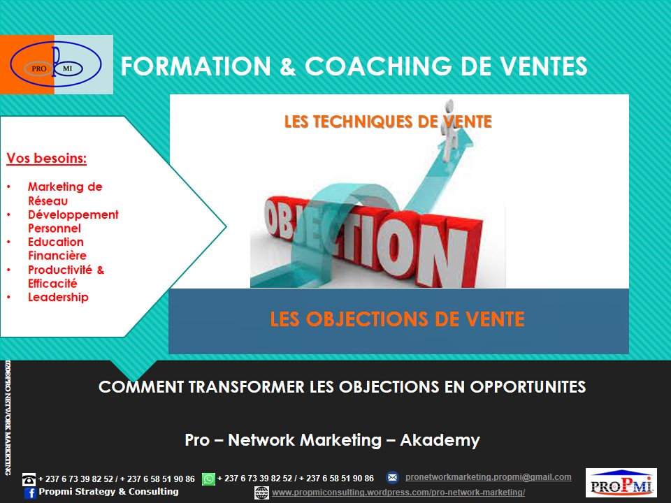 PROFITEZ DE NOTRE EXPERTISE & EXPERIENCE EN FORMATION & COACHING DE VENTES Êtes-vous PRÊT pour devenir un meilleur vendeur/ une meilleure vendeuse? FORMATION: LA PRÉVENTION ET LE TRAITEMENT DE OBJECTIONS DE VENTE Introduction: Les objections sont les bêtes noires de tous les vendeurs. Comment les prévoir et les traiter est un art et une science…