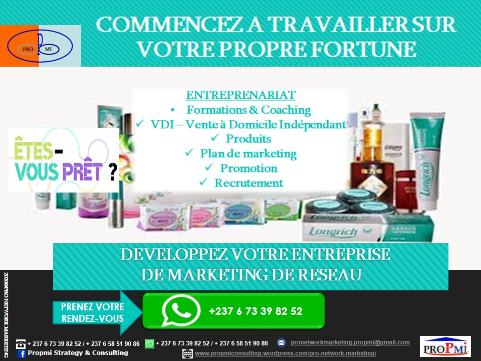 | Participants ciblés: | Cette offre est destinée à toutes personnes ambitieuses tels que: => diplômés à la rechercher de l’emploi, => aux salariés ou travailleurs à la recherche de revenus complémentaires, => aux personnes sans ou avec emploi, => à la classe ouvrière ou des personnes de petits métiers (p.ex.: ménagères, électriciens, maçons, plombier, etc.), => aux vendeurs ou vendeuses diverses, => en effet toutes les classes sociales. |