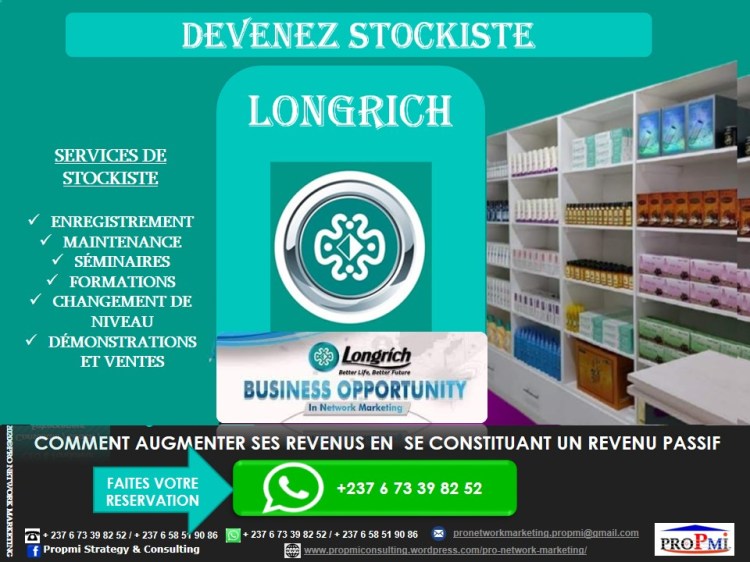 Un stockiste chez LONGRICH Bioscience International c’est celui qui prend la décision, s’engage et signe. Un stockiste représente l’entreprise partout où c’est nécessaire. Un stockiste est le seul à pouvoir enregistrer les nouveaux membres. Il est aussi celui chez qui les membres peuvent obtenir les produits au même prix, comme s’ils étaient directement fournis par l’entreprise.