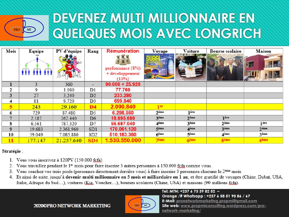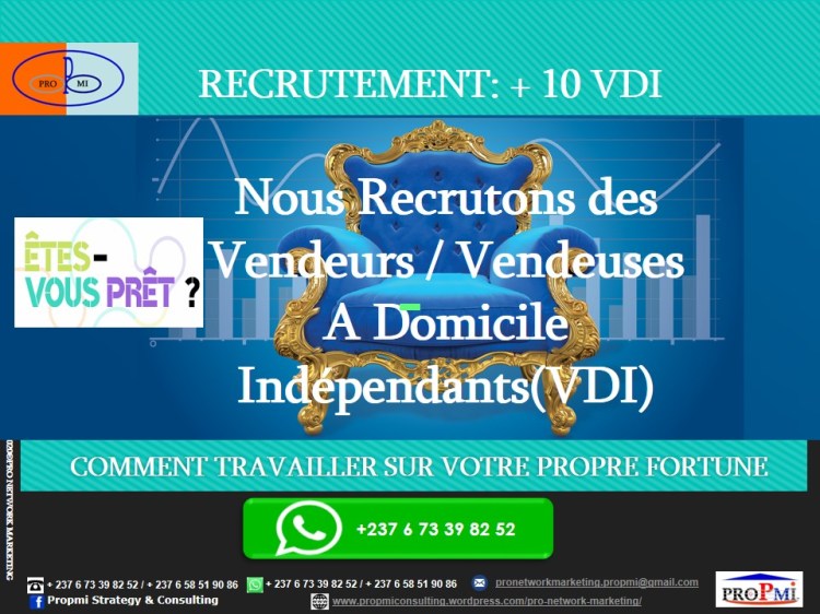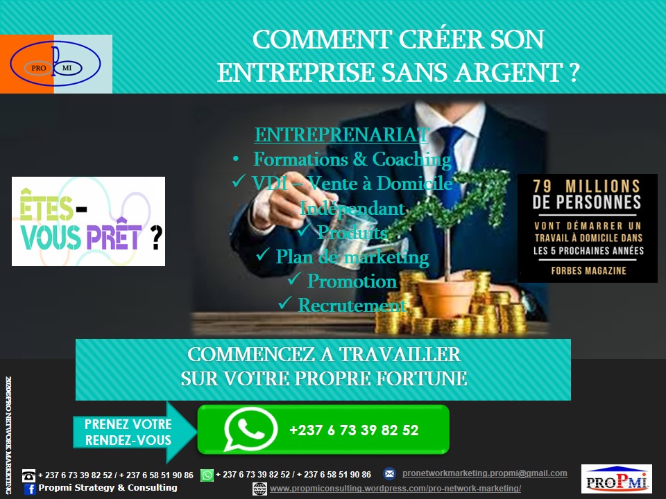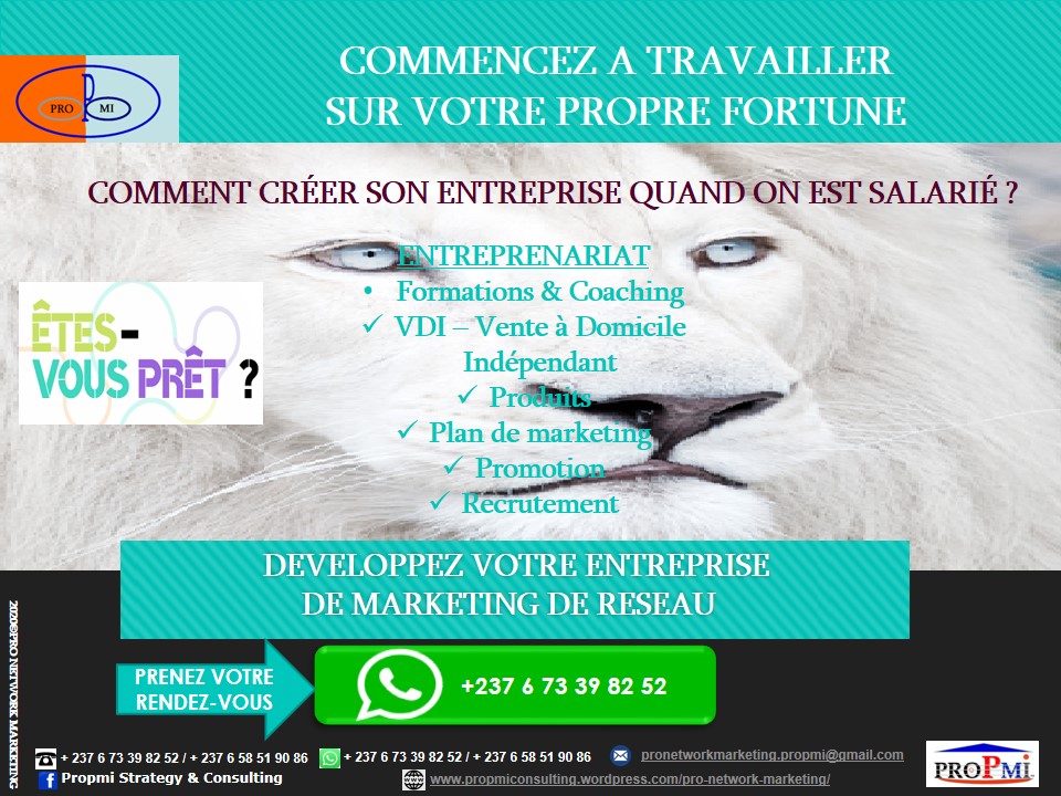 Si vous aussi vous voulez devenir un Professionnel du Marketing de Réseau, contactez-nous sur WhatsaApp: (+237 6 73398252/658519086) ou par email: pronetworkmarketing.propmi(@)gmail.com ou prendre un rendez-vous en remplissant le formulaire de RDV.