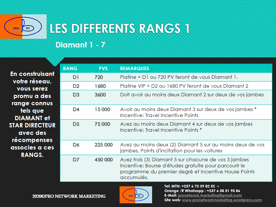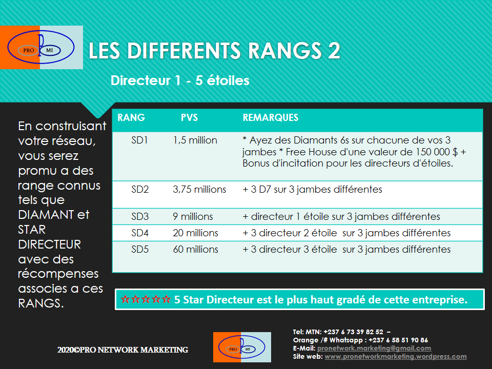 En construisant votre réseau, vous serez promu à des range connus tels que DIAMANT et STAR DIRECTEUR avec des récompenses associées à ces RANGS.